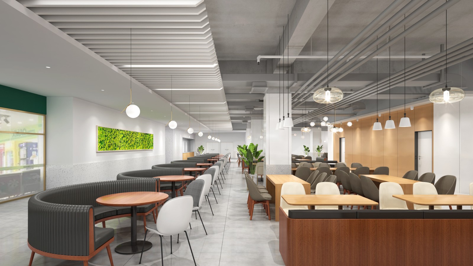 ? ? 至臻至美,追求卓越,金楓設(shè)計(jì)對(duì)美的感受和追求體現(xiàn)在員工餐廳設(shè)計(jì)的整體與細(xì)節(jié)把控。整個(gè)餐廳統(tǒng)一采用裸頂天花加噴漆處理,在提升空間立體感的同時(shí),營(yíng)造出現(xiàn)代工業(yè)風(fēng)的裝飾基調(diào)。縱橫的線路管道與橫梁交織相錯(cuò),懸以北歐風(fēng)格的吊燈矩陣,與水泥色地板整體呼應(yīng),充分發(fā)揮空間結(jié)構(gòu)的形式美。